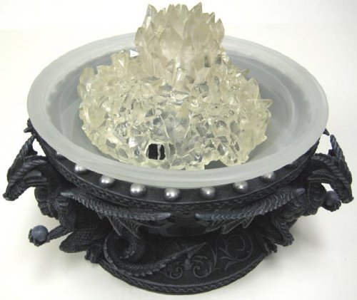 This ultra cool winged dragon mist making water fountain is the perfect addition to medieval decor, and fits on just about any table top. Made of cold cast resin, this fountain features 3 scary looking dragons with wings spread and orbs in one claw around the base. A frosted glass bowl holds the water and the mist maker, sending an ethereal fog up through the top of the clear "crystal" cover, and LED lights change in color from green to red to blue. It measures 11 inches in diameter and stands 9 inches high, with incredible detailing in the features of both the dragons and the Celtic knotwork designs on the top and bottom rim.This mist fountain is brand new, never used, and makes a great gift for any dragon lover.